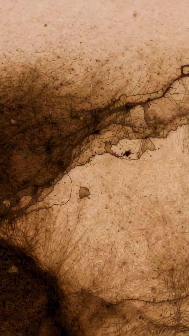AI Generated Video. Vertical video panning across sepia-stained fibrous paper, showing network of tiny pores, hairline cracks, and layered stain gradients. Macro perspective emphasizing texture contrast between pale substrate and dark fibrous mark, creating abstract organic pattern. High-contrast sepia tone evoking vintage, aged material and archival surfaces. Suitable for background layers in motion graphics, texture overlays in film and video, packaging mockups, book covers, editorial layouts, and website hero visuals. Useful for art and design projects requiring tactile, grunge, or antique aesthetics, or for scientific illustrations exploring porous materials. Clip functioning as looping background or short opener sequence, supporting color grading and blending modes for seamless integration.