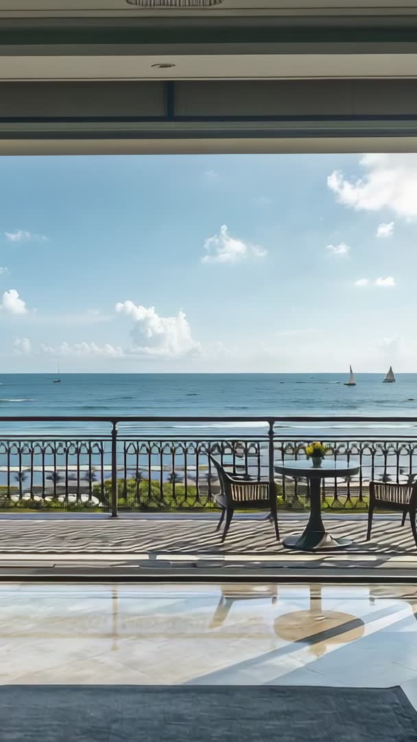 AI Generated Image. Panning down from interior toward sunlit seaside terrace, revealing bistro table with small vase of yellow flowers and two chairs facing ocean. Ornate railing framing horizon while sailboats drifting on calm water under blue sky with scattered clouds. Polished floor reflecting sunlight, creating strong foreground interest and symmetrical lines. Video in vertical 9:16 format, delivering cinematic tall-frame composition ideal for mobile-first platforms. Ample negative space in sky and floor allowing easy placement of headlines or lower-third text. Working well for travel commercials, hotel and resort promotion, hospitality marketing, lifestyle and wellness content, real estate virtual tours, and social media vertical ads. Use as B-roll for relaxation scenes, vacation booking pages, seasonal campaigns, or background for voiceover and music. Color palette featuring soft blues and warm highlights, supporting serene upscale mood.