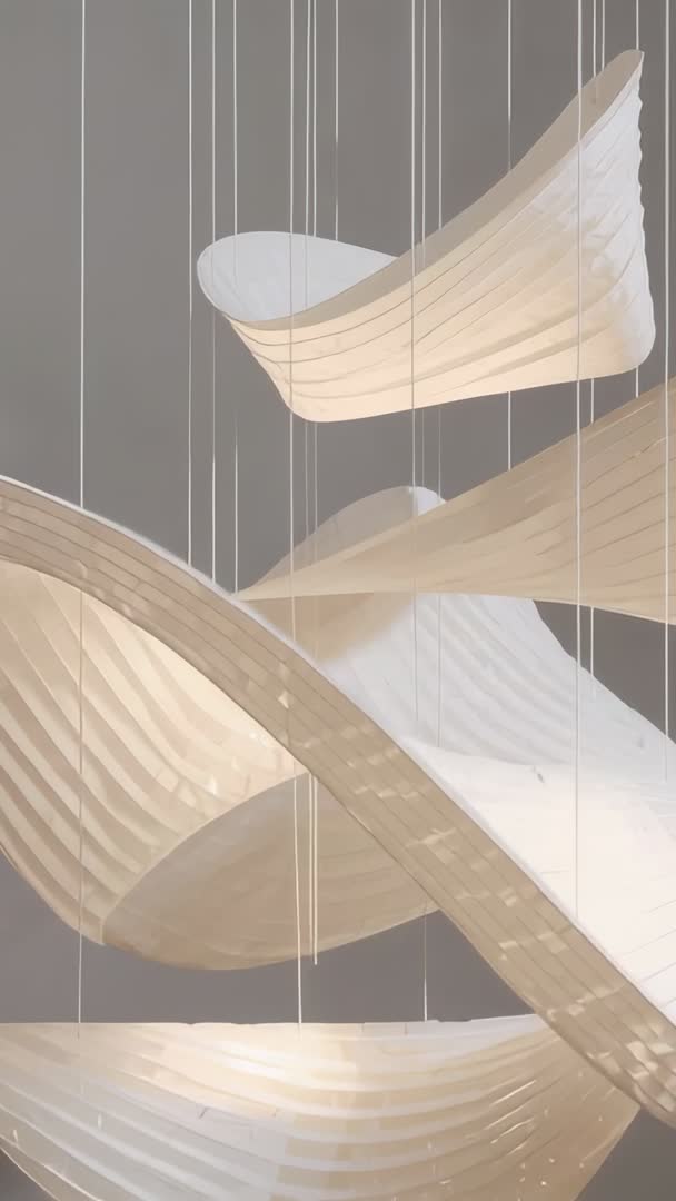 AI Generated Video. Vertical video showing panning movement across suspended ribbed pendant shades gently swaying and emitting warm translucent glow. Composition focusing on layered curved forms, soft shadows, and subtle motion lines from fine suspension cables. Neutral palette and minimalist aesthetic creating calming, elegant mood. Ideal for b-roll and visual intro clips for interior design, lighting brands, gallery installation promos, hotel or restaurant ambiance reels, social media vertical ads, and architecture portfolios. Working well for background loops behind text overlays and title cards; safe areas available at top and bottom for copy. Suggest pairing with soft ambient music or quiet piano, applying subtle slow color grade to preserve warm tones, and creating seamless loop by matching start and end frames. Screenshot stills usable for product catalog and editorial use. Licensing suitable for commercial and editorial projects.