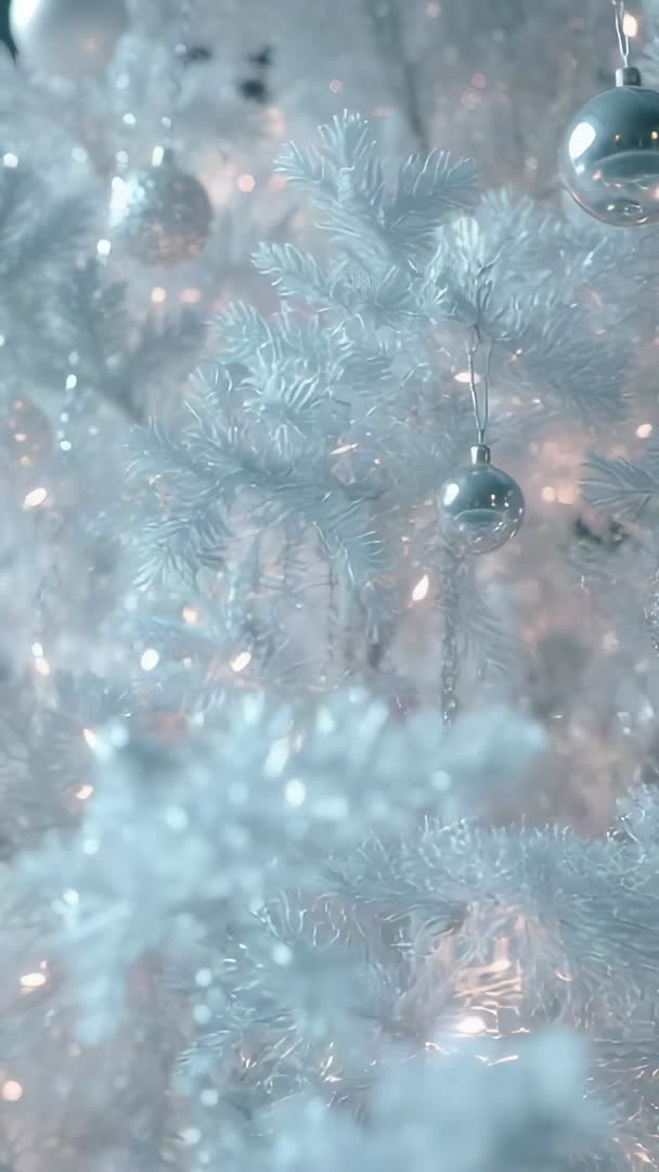 AI Generated Image. Vertical panning video capturing white Christmas tree branches decorated with reflective silver baubles and warm fairy lights. Soft bokeh and cool tonality creating elegant, tranquil holiday mood. Ideal for vertical social media content such as Instagram Stories, Reels, TikTok, Pinterest Idea Pins, mobile ads. Useful as background b-roll for seasonal commercials, online store hero banners, greeting video intros, event invitations, in-store display loops. Supporting color grading and overlaying text or logos for branding, product launches, holiday sale promotions. Pairing with slow motion or gentle music for enhanced cinematic feel. Delivering versatile aesthetic for minimalist holiday campaigns, wedding winter scenes, lifestyle vignettes, festive editorial pieces.