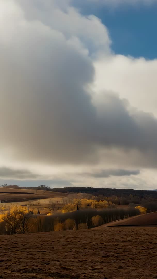 AI Generated Image. Vertical video panning across golden farmland and rolling hills, revealing drifting cumulus clouds and layered tree lines. Featuring warm late-afternoon light, gentle shadows, expansive sky creating dramatic cloud contrast. Suiting landscape videos, nature documentaries, travel promos, agricultural storytelling, seasonal marketing, and social media vertical reels. Working well as moving background for title cards, app hero banners, environmental campaigns, or calming interstitials in video edits. Allowing simple slow-motion, subtle color grading, or gentle zoom to enhance mood. Recommended specs: 9:16 vertical aspect, 4K source, soft stabilization for smooth playback.