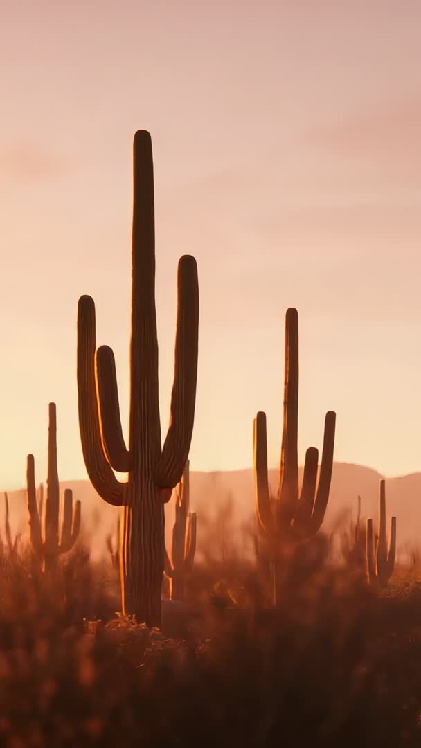 AI Generated Video. Vertical video starting with slow panning over desert at sunset, showcasing tall saguaro cactus silhouettes against warm sky. Golden hour light bathing ridge and shrubs, creating soft silhouettes and long shadows and evoking calm and solitude. Scene conveying natural beauty, wide open space, and timeless desert mood. Useful for travel promos, nature documentaries, social media stories and reels, meditation and wellness apps, website hero backgrounds, environmental campaigns, broadcast title sequences, and vertical ads. Suggested postproduction: add ambient desert soundscape or gentle music bed, apply slow crossfade or subtle color grade to enhance warm tones, or loop clip for seamless mobile background.