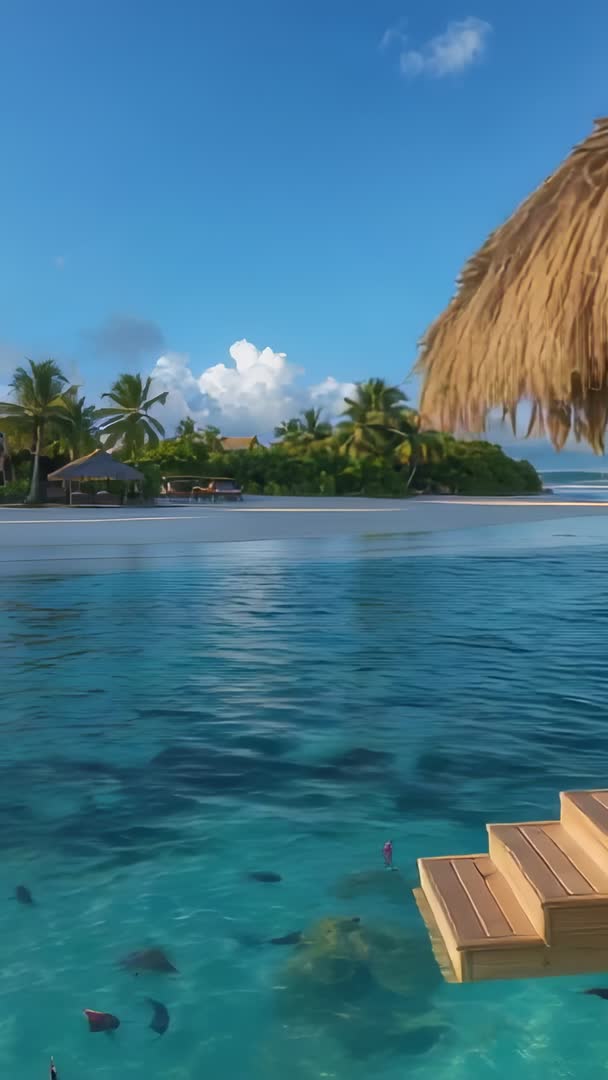 AI Generated Video. Vertical video panning left, showing overwater pavilion and wooden steps descending into turquoise lagoon with visible tropical fish and palm-fringed island in distance. Bright blue sky with scattered clouds creating serene, sunlit mood. Composition providing wide copy space in upper frame for headline or product placement. Optimizing for mobile vertical playback (9:16), featuring gentle pan motion and steady speed for loopable background. Usage ideas including travel and resort promos, hotel and villa booking listings, social short-form content (Instagram Reels, TikTok, YouTube Shorts), tourism campaigns, luxury travel commercials, wellness and spa branding, aerial travel montages, background for nature or relaxation playlists. Post-production tips: leaving top third clear for headline, placing logo or CTA in bottom third, applying soft warm color grade, adding ambient ocean sounds or mellow instrumental track, enabling seamless loop for lobby screens or story ads. Clip length working well for short ads, social reels, or B-roll sequences.