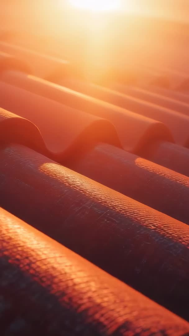 AI Generated Image. Vertical video panning across weathered corrugated roof during golden hour, showing warm sun flare and deep surface texture. Close-up ridges and repeating waves creating strong diagonal lines and abstract architectural pattern. Use for roofing company marketing, construction industry promos, urban lifestyle reels, website hero backgrounds, and social media shorts. Suiting mood-setting scenes, title transition clips, texture overlays, and environmental storytelling. Offering cinematic warm tones, natural lens flare, and authentic aged surface details for seasonal campaigns and sustainability narratives.