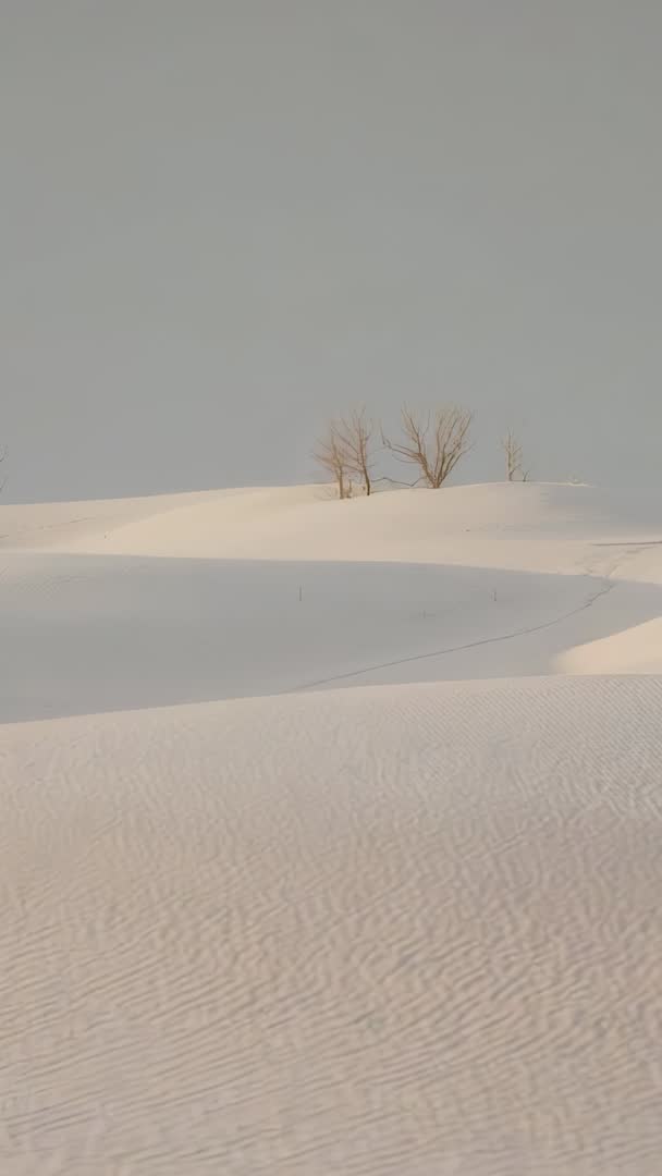 AI Generated Video. Panning vertically across soft snow dunes, centering small group of leafless trees on distant ridge. Camera movement revealing faint curved track cutting through wind-sculpted ripples under muted pastel sky. Minimal composition emphasizing negative space, surface texture and quiet mood, with soft diffuse light creating gentle shadow lines. Working well for social media reels, mobile hero clips, website background loops, documentary cutaways, environmental editorials and mindfulness or meditation content. Slowing footage for cinematic atmosphere, looping for ambient background, applying cool color grade for crisp winter tone or warm grade for nostalgic mood, and combining with subtle ambient audio for immersive sequences.