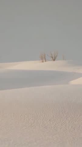 - Vertical panning over winter sand dunes centering bare trees on windswept snowy ridge