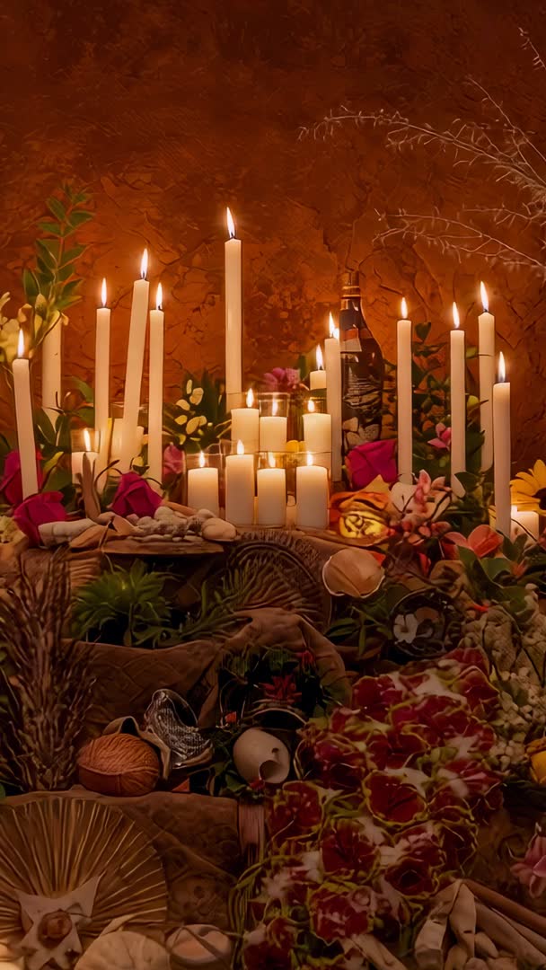 AI Generated Image. Vertical video showing slow panning across candlelit altar nestled in terracotta niche, revealing layers of tapered and votive candles, lush florals, textured fabrics, and decorative vessels. Warm amber light bathing scene, creating intimate moody atmosphere ideal for wellness, meditation, ritual, and home decor stories. Clip useful for opening shot in interior design reels, social media ads for candle and lifestyle brands, background for guided meditation or ceremony videos, and seasonal editorial content. Color palette and composition supporting overlay text, logo, and slow voiceover. Longer versions working for lifestyle montage; shorter loops fitting Instagram stories, TikTok, and hero headers.