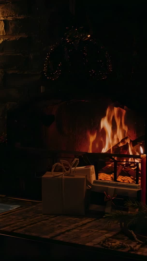AI Generated Video. Vertical video panning left, revealing flickering fireplace, wrapped gifts on hearth, lit candles and wreath above mantel. Warm orange and amber flames casting soft glow across rustic brick and wood surfaces, creating intimate holiday mood. Gentle camera movement and natural firelight flicker highlighting textured details and cozy atmosphere. Ideal for seasonal content use: holiday social media posts, instagram stories, reels, tiktok clips, mobile ads, website hero banners, email marketing headers, and digital greeting videos. Useful as looping background for cozy product overlays, recipe or lifestyle videos, restaurant and hotel holiday promos, and festive event invitations. Recommended postproduction tips: pair with soft instrumental music or warm voiceover, color grade to deepen warm tones, add animated holiday text or subtle snow overlay for extra seasonal flair.