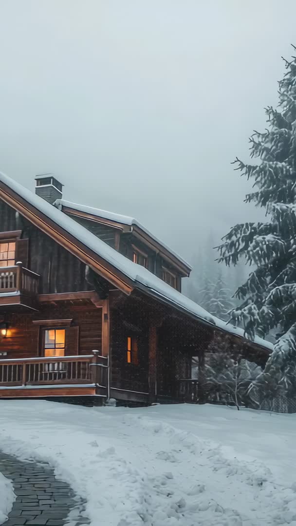 AI Generated Video. Vertical video showing slow upward pan from snow-covered path toward fog-shrouded timber chalet with warm glowing windows and surrounding snow-laden pine trees. Atmosphere conveying cozy, cinematic winter evening mood for travel, hospitality, mountain retreat promotions. Working well for social media reels, Instagram stories, vertical ads, travel vlogs, lodge and resort marketing, holiday greeting videos. Offering ample negative space in sky area for text overlays, logos, or lower-third captions. Allowing color grading to boost warm interior glow or enhance moody cyan tones. Pairing with gentle ambient music, crackling fireplace sound, or soft voiceover describing mountain getaway. Ideal for seasonal campaigns, rental listings, blog hero headers, tourism websites, cinematic openers, or background for weather segments.