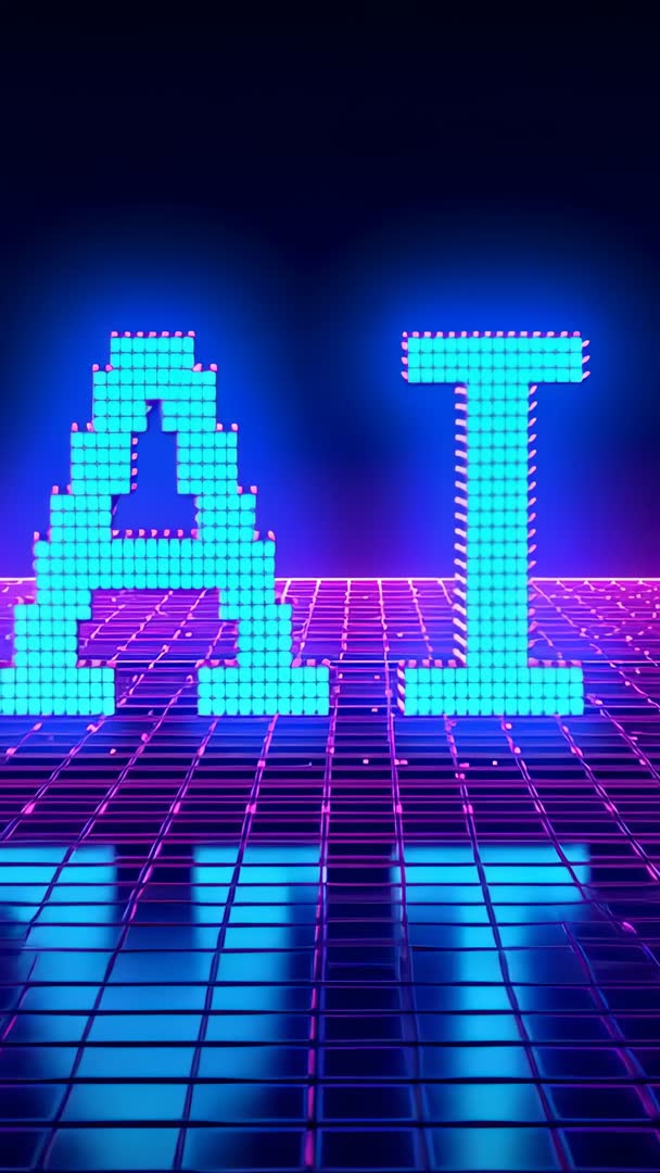 AI Generated Video. Vertical loopable clip showing neon AI letters pulsing over magenta grid floor with cyan glow and mirrored reflections. Featuring pixelated glyphs and retro-futuristic vaporwave palette with dynamic camera panning from top to bottom. Ideal for tech presentations, app intros, startup pitch decks, social media vertical ads, Instagram Reels, YouTube Shorts, conference openers and event promos. Helping convey themes of artificial intelligence, digital innovation and cyberpunk aesthetics. Allowing easy overlaying of logo or title in upper frame or adding lower third text over reflection. Supplying high-contrast visuals for banner backgrounds, landing pages, motion graphics templates and promotional campaigns. Delivering loop-friendly motion for seamless repeating playback.