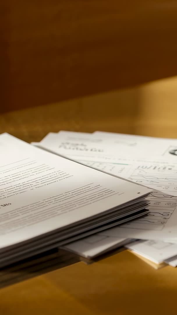 AI Generated Video. Panning across printed report and handwritten notes on wooden desk, highlighting paragraphs, diagrams, and stacked paperwork. Using as vertical B-roll for corporate videos, training modules, financial reviews, legal briefs, and social media stories or reels. Pairing with voiceover summarizing key findings, animated overlays highlighting charts, and lower-third text for headline metrics. Cropping for mobile-first distribution and adjusting color grade for warm, focused mood. Providing clean, professional footage for newsroom sequences, client presentations, productivity blogs, workflow tutorials, and marketing or internal communications.