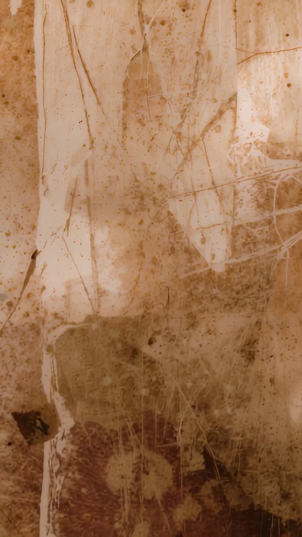 AI Generated Video. Vertical clip panning across stained plaster wall, revealing floral mark emerging from weathered patina as light shifts. Closeup texture featuring scratches, speckled stains, and subtle film grain, evoking vintage decay and urban grunge. Useful for background loops, title sequences, film openers, and social media reels needing moody texture or aged aesthetic. Works well as texture overlay for color grading, set dressing in interior design visuals, or B-roll for documentary sequences about restoration, architecture, or heritage spaces. Compatible with tall aspect layouts such as stories and reels. Recommend looping short segment, adding subtle speed ramp or vignette, and layering with soft ambient sound for atmospheric result.