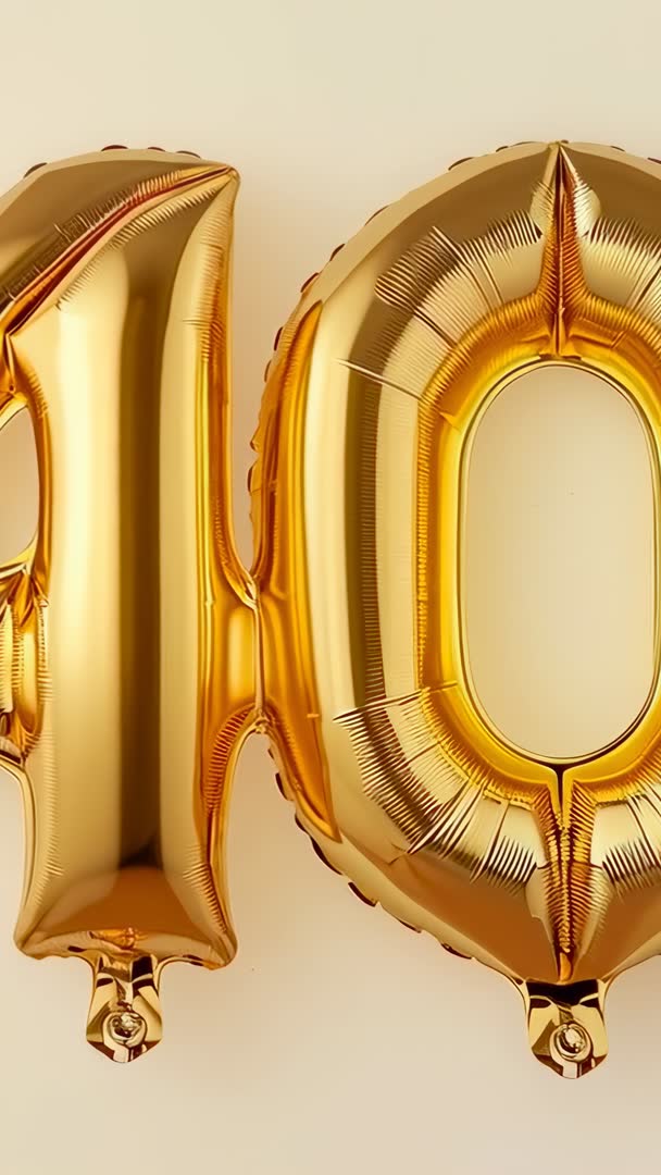 AI Generated Video. Showing vertical panning of gold foil '40' balloons against beige backdrop, highlighting metallic sheen, tied tabs, and reflective surface. Working well for 40th birthday, anniversary, milestone campaign, store display, party invite, or event promo. Ideal for mobile platforms such as Instagram Reels, TikTok, Stories, and vertical ads. Looping-friendly clip for background on event pages, hero banners, countdown videos, and social headers. Color palette matching ideas include warm neutrals, black, white, blush pink, deep green, and navy. Editing tips: slow motion crop for close-up detail, add confetti overlay, place text overlay on right side for copy, use soft vignette to enhance shine. File recommendation: high-resolution vertical format, short loopable clip optimized for mobile delivery and social advertising.