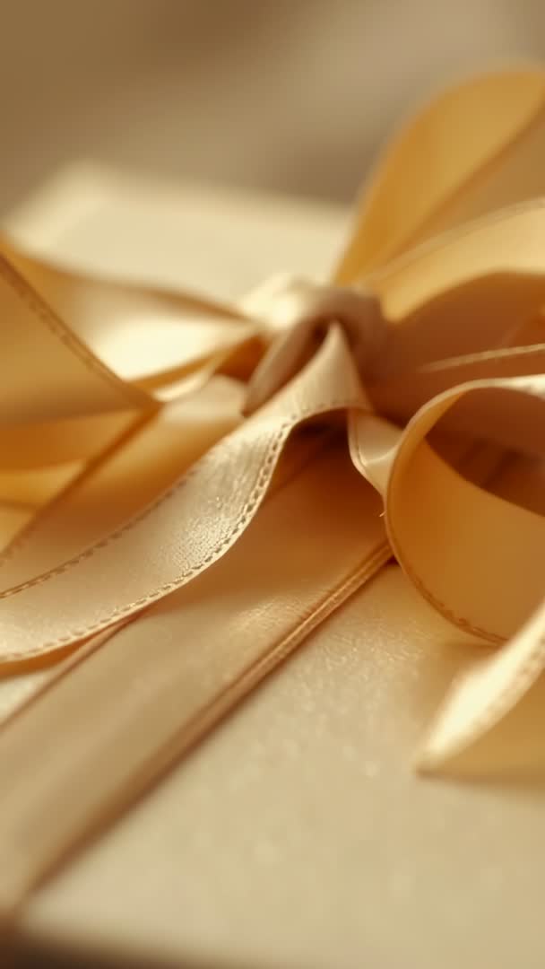 AI Generated Video. Vertical 9:16 footage showing close-up panning across gold satin ribbon bow on luxury gift box. Focus shifting from bow loops to textured box surface, creating elegant shallow depth of field and soft bokeh highlights. Warm golden tones and satin shimmer evoking luxury, celebration, and craftsmanship. Ideal for mobile ads, social media reels, product pages, holiday and wedding promotions, gift wrap tutorials, and branding content. Clip working well as looping background for text overlay, title cards, or hero banner on landing pages. Use with slow ambient music or gentle piano for cinematic mood. Duration suitable for short vertical formats (6–15 seconds) and adaptable to Instagram Stories, Reels, TikTok, and mobile web banners. Color palette featuring champagne gold and warm beige, delivering refined and celebratory atmosphere.