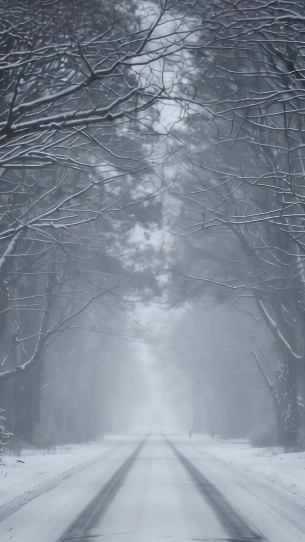 AI Generated Video. Video showing vertical panning along snow-covered road through dense pine forest forming tunnel of bare branches and rising fog. Tire tracks creating strong leading lines toward distant vanishing point, fog and mist creating moody, tranquil atmosphere. Lighting displaying soft, muted blue tones and high contrast between dark trunks and pale snow, conveying cold, contemplative mood. Working well as vertical background for social media stories, reels, mobile wallpapers, ambient video loops and vertical ad banners. Serving as atmospheric opener for winter travel commercial, nature documentary, meditation and relaxation app, book cover for mystery novel, seasonal greeting card or environmental campaign. Editing suggestions: adding subtle wind and distant crunching for realism, using slow crossfade and gentle color grade to enhance cinematic, introspective feel.