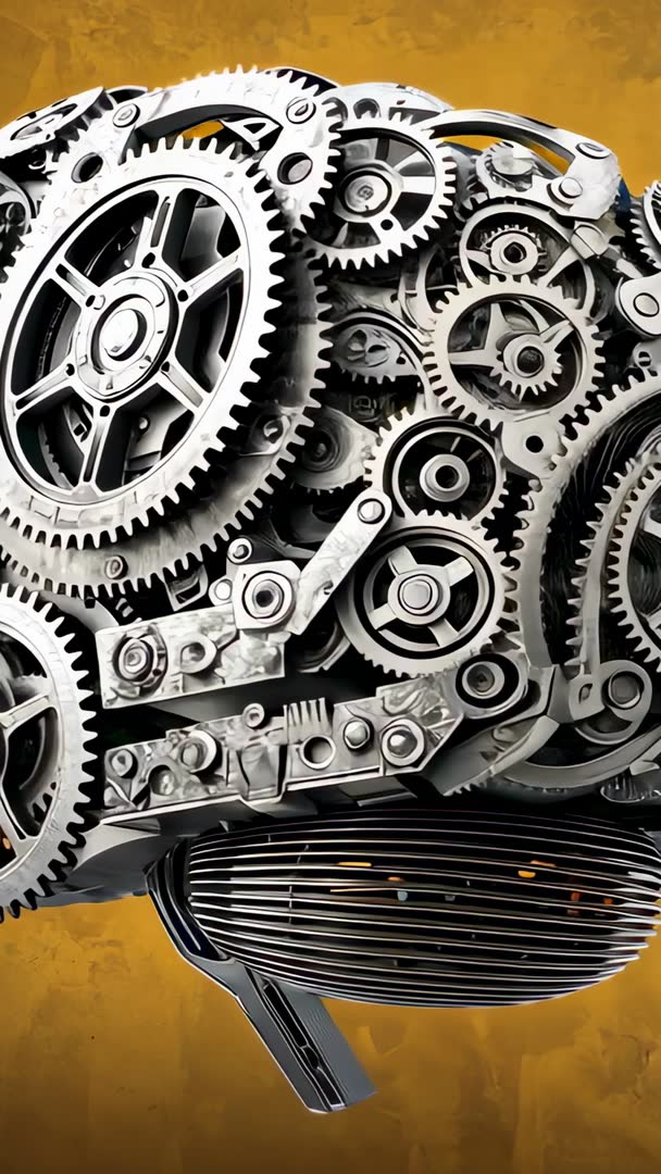 AI Generated Video. Vertical panning revealing interlocked metallic gears, toothed cogs, linkages, and vented fin, offering rhythmic kinetic motion and sculptural industrial detail. Close-up framing emphasizing gear train, bearings, shafts, and textured steel surfaces with high-contrast highlights. Warm ochre background providing color contrast to chrome-like metal. Suiting industrial branding, engineering explainer videos, factory training modules, product design demos, and automation presentations. Serving as dynamic background for social media vertical ads, YouTube Shorts, Instagram Reels, and LinkedIn posts. Pairing with techno or cinematic soundtrack for dramatic opener or transition. Allowing overlay of animated titles, diagrams, or product callouts for use in marketing, editorial features, technical tutorials, or concept reels.