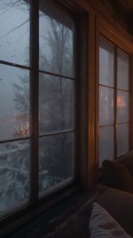 AI Generated Video. Vertical panning through wet window panes, droplets sliding down glass, snow-laden tree silhouettes blurring outside, warm lamp glow reflecting on glass, couch cushions visible at lower right. Scene evoking quiet winter evening, creating contrast between cold outdoors and warm interior comfort, establishing moody cinematic atmosphere. Footage working well for winter lifestyle videos, holiday marketing, hygge content, interior design promos, cabin rental listings, social media vertical ads, background for relaxation or meditation apps, and cinematic B-roll for film or TV. Color palette and soft focus allowing text overlay or title cards in negative space along right-hand window panels.