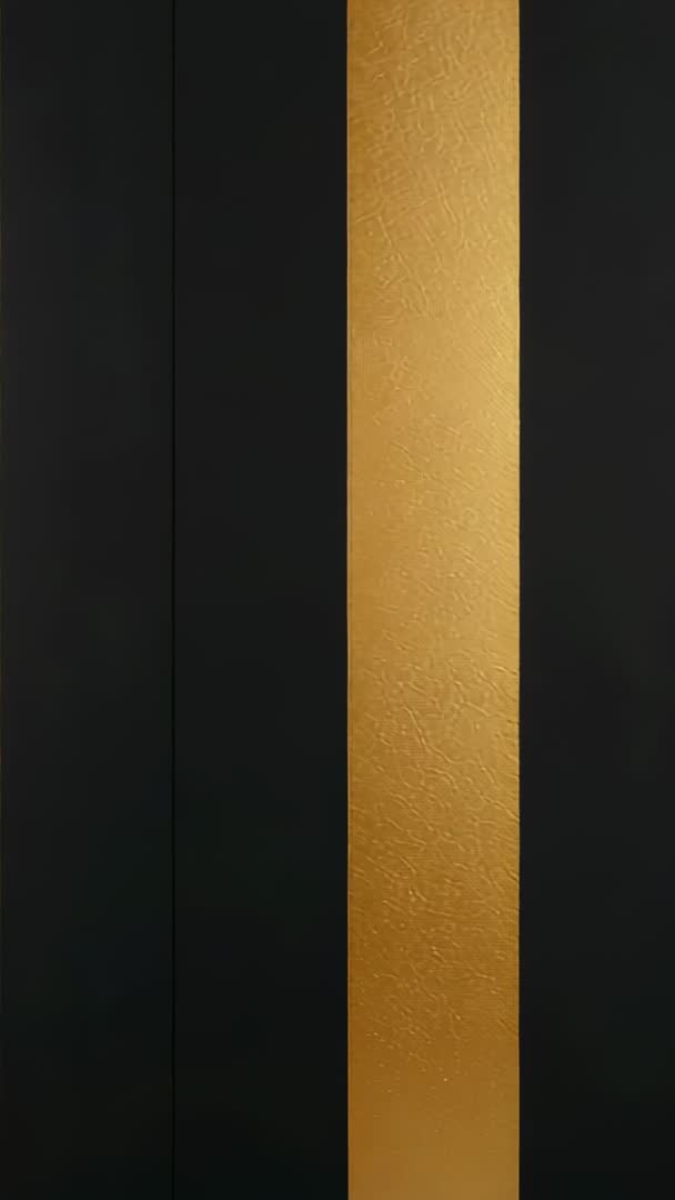 AI Generated Video. Panning camera revealing vertical gold stripe sweeping across matte black lobby panels, highlighting metallic texture and subtle panel seams. Capturing slow, smooth motion and strong symmetry for elegant minimalist visuals. Optimized for 9:16 vertical format, usable as background for luxury brand promos, hotel and commercial interior showcases, architectural detail highlights, or social media ads. Offering seamless loop potential for ambient backgrounds, lower thirds, or title cards; pairing well with ambient music, minimal typography, and warm color grading. Providing close-up texture detail useful for pattern overlays, packaging mockups, editorial layouts. Ideal for designers, marketers, architects seeking refined motion element for digital campaigns and presentations.