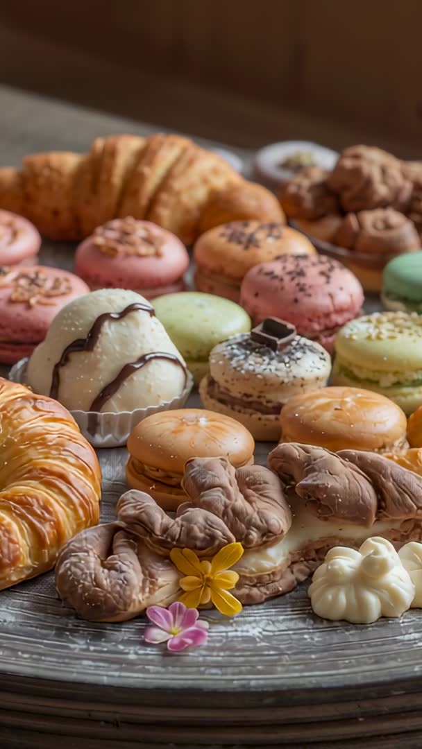 AI Generated Image. Video panning across rustic tray of braided cookies, croissant and colorful macarons, bathed in warm natural light and shallow depth of field. Scene featuring meringue kisses, chocolate squares and edible flowers for delicate styling. Serving bakery marketing, social media reels, recipe intros, cafe website headers and culinary course promos. Recommending vertical 9:16 crop with lower-third text safe zone for branding overlays. Suggesting soft acoustic or upbeat bossa nova for background mood. Highlighting pastel color palette and warm wood tones for cohesive brand look. Licensing options covering commercial advertising and editorial use.