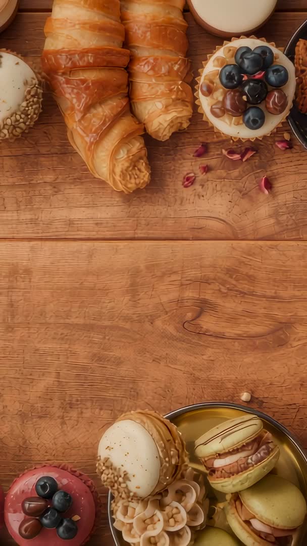 AI Generated Image. Camera panning vertically, revealing golden croissants, fruit-topped tart, and stacked macarons arranged on rustic wooden board. Close-up framing highlighting flaky layers, glossy glazes, nut toppings, and fresh blueberries while warm natural light enhancing wood grain and pastry textures. Vertical framing making content ideal for mobile platforms such as Instagram Reels and TikTok, and for vertical ads or in-app promos. Suggested uses include promoting bakery offerings, launching menu items, creating recipe intro clips, adding hero visuals to food blogs, and supplying background footage for culinary editorial pieces. Editing tips: try looping pan for ambient background, slowing motion for glaze shine emphasis, adding animated text overlays in lower third, color grading for warm tones, and applying soft vignette for focused composition.