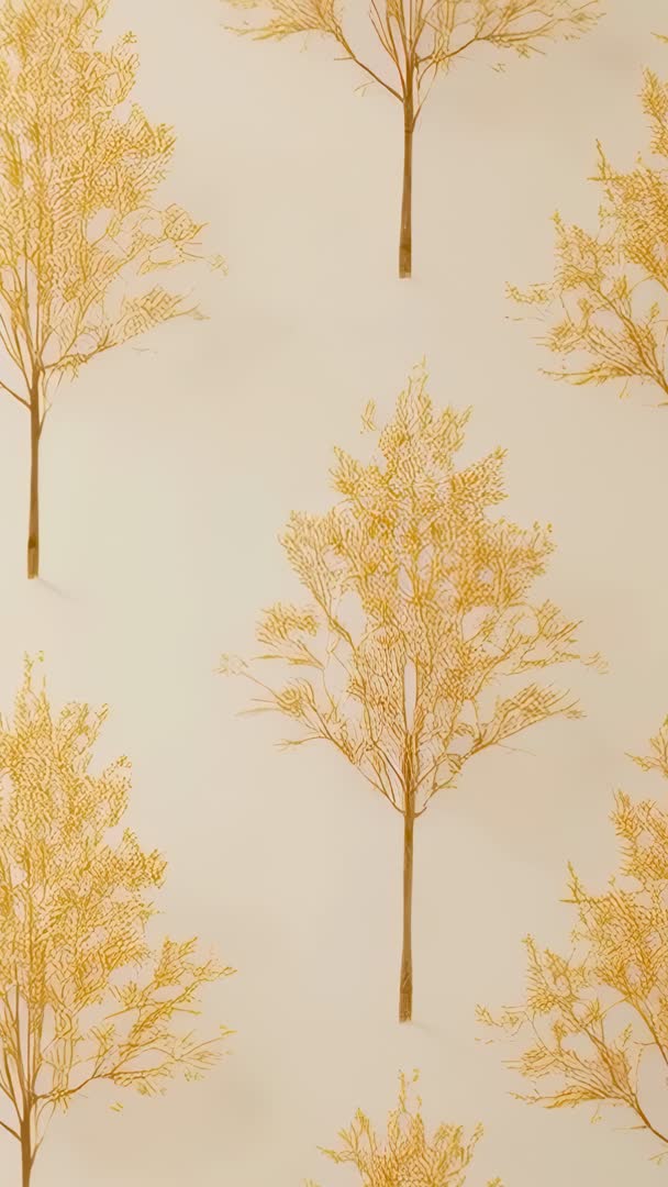 AI Generated Video. Video panning upward across interior wall covered with golden tree wallpaper, highlighting repeating botanical motif and warm mustard-gold palette. Camera revealing delicate branch linework and subtle paper texture while maintaining gentle vertical motion. Ideal for promoting wallpaper collections, creating interior design reels, supporting home decor ecommerce, showcasing pattern repeat for textile or stationery development, and producing social media vertical ads. Useful as looping background for product videos, moodboard clips, brand hero banners, or store display screens. Editing suggestions: keeping slow steady pan 6-12 seconds, looping seamless for continuous play, cropping for Instagram Reels and TikTok, adding warm ambient music, overlaying minimalist typography for product name or price, and adjusting color grade to enhance gold tones.