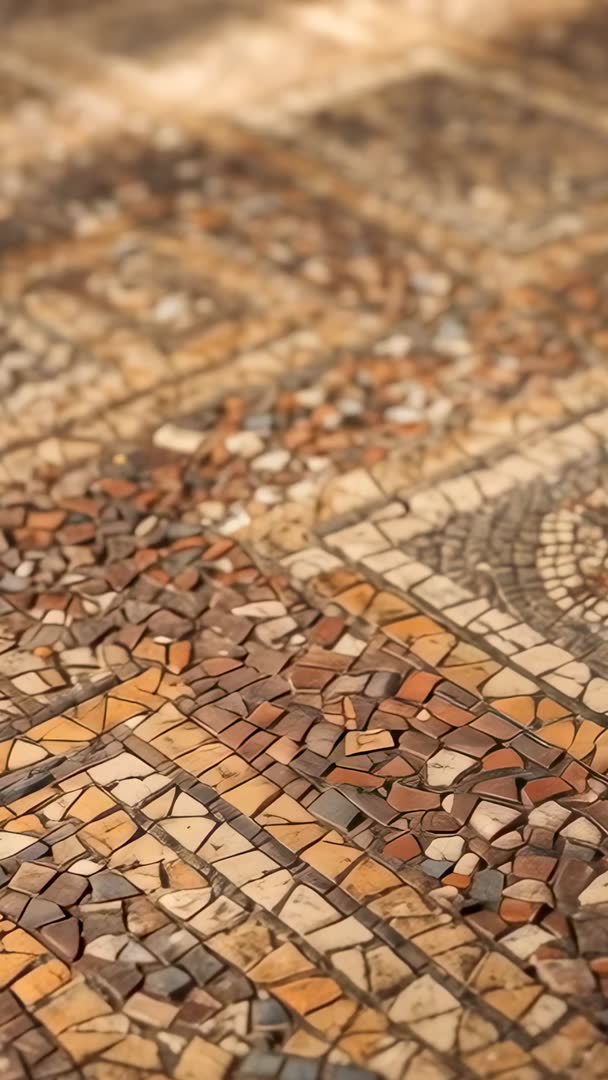 AI Generated Video. Vertical panning shot showing mosaic floor medallion inside museum gallery, focusing on tesserae texture and warm terracotta and cream tiles. Camera moving slowly across circular motif and decorative border, revealing intricate geometric pattern and subtle color variations. Shallow depth of field and gentle camera motion creating cinematic, tactile mood. Working well for history documentaries, museum exhibition promos, architecture and restoration presentations, cultural heritage content, travel reels, social media vertical ads and website hero banners for conservation organizations. Adding elegant backdrop for title overlays and voiceover, ideal for looping ambient footage and slow-motion cuts during editing.
