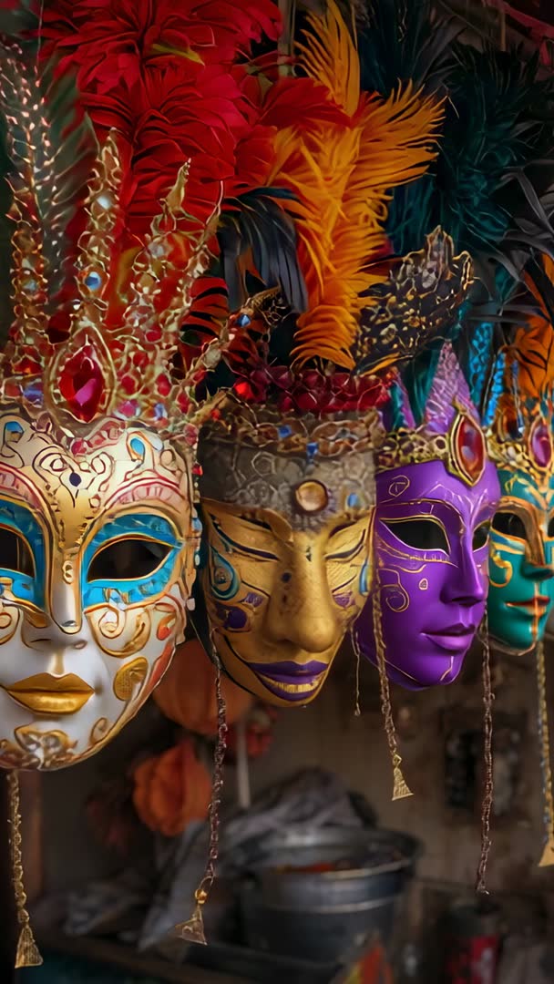 AI Generated Image. Vertical panning video showcasing ornate masquerade masks hanging from market stall, featuring vibrant feathers, gold leaf accents, and gem-encrusted crowns. Camera moving right while focusing on intricate hand-painted details, embossed metalwork, and dangling tassels, revealing depth and rich color contrast. Ideal for social media vertical content including Instagram Reels, TikTok, Stories, YouTube Shorts; suitable for travel and culture segments, carnival festival promotions, costume shop advertising, artisan craft features, or background b-roll for luxury fashion edits. Editing suggestions: using slow dissolve cuts, adding rhythmic brass and percussion music, capturing close-up insert shots for texture, applying color grading to enhance jewel tones. Licensing ideas: event promo, shop ecommerce hero clip, travel blog opener, festival invitation animation, retail window display loop.