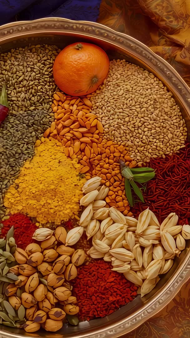 AI Generated Video. Vertical panning shot revealing ornate brass tray filled with vibrant spices, seeds and nuts on rich blue and gold fabrics. Close-up frames capturing textures and colors, featuring bright turmeric powder, orange fruit, cardamom pods, pistachios, various lentils and red chili threads. Slow camera movement creating cinematic reveal sequence suited for vertical platforms and social media reels. Suiting food blog intros, recipe videos, market or festival b-roll, grocery or spice brand ads, restaurant promos, packaging backgrounds and cultural travel segments. Leaving room for title or lower-third overlays and logo placement. Using warm, festive palette to evoke traditional culinary heritage and handcrafted market displays.
