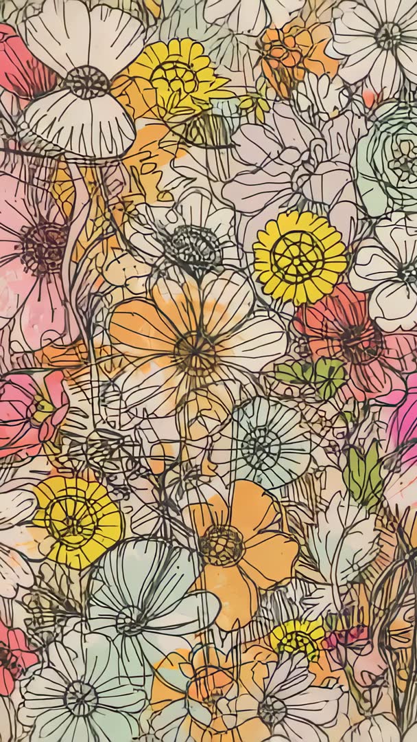 AI Generated Image. Camera panning vertically across closeup pastel floral motif featuring layered watercolor washes and delicate black line work. Palette featuring soft peach, mint, lemon, blush and warm orange creating gentle vintage-inspired mood. Pattern repeating and appearing seamless for easy tiling in textile and wallpaper projects. Serving as motion backdrop for vertical content including social media reels, stories, mobile ads and product videos. Complementing branding and packaging for beauty, stationery, home decor and fashion. Working well as loopable clip for calming transitions, promotional overlays and website hero sections. Providing high-resolution detail for print and digital use, enabling cropping for thumbnails, banners and background layouts.