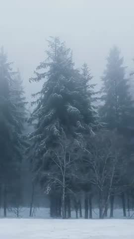 AI Generated Video. Showing vertical panning across tall fir trees shrouded in dense fog, revealing open gap in snow while mist rising from forest floor. Cinematic blue-tint monochrome palette creating moody, minimal atmosphere and strong sense of cold and solitude. Ideal for background footage in winter travel promos, nature documentaries, meditation and mindfulness apps, social media vertical ads, cinematic title sequences, seasonal website hero banners, and product campaigns for outdoor clothing and gear. Useful as b-roll for film projects, calming loop for relaxation videos, or atmospheric opener for podcasts and storytelling. Available in vertical format suited for mobile-first platforms and social reels, with room for overlay text or logo on clean snowy foreground.