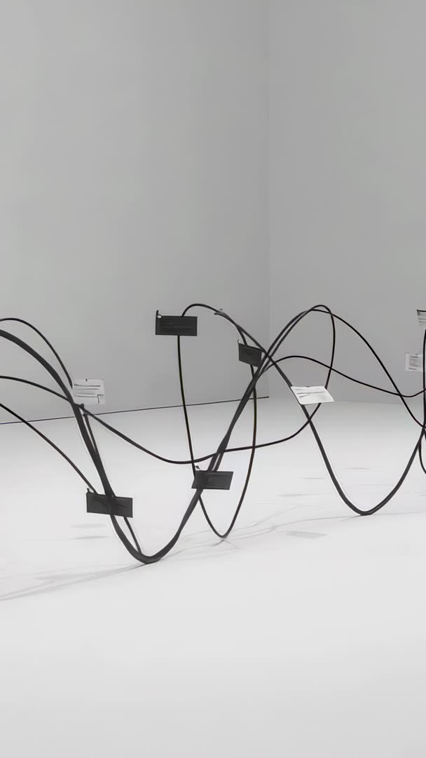 AI Generated Video. Panning across low black metal loops and placards in clean white gallery. Camera focusing on sinewave curves and small informational labels attached to rods. Minimal monochrome composition emphasizing negative space and shadow from sculptural lines. Footage working well for art exhibition promos, museum social media reels, contemporary art blogs, and background visuals for design presentations. Including title sequences, gallery event teasers, educational clips about sculpture, and product banners for modern art venues. Recommending slow crossfades, muted soundtrack, and subtle color grading to preserve minimal aesthetic.