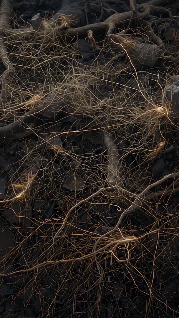 AI Generated Video. Vertical macro pan moving along exposed root mat on bank, showing dense tangle of fine fibrous roots, woody knots, rocks and compacted soil. Slow cinematic camera movement providing immersive study of root network texture and pattern. Natural dark earthy tones creating moody backdrop for nature sequences. Ideal for environmental documentaries, erosion control and streambank restoration stories, botany and mycology explainers, science education videos, conservation campaigns. Also working well as vertical reel, social media background, website hero banner, motion graphic texture overlay or textured background for titles. Recommend applying gentle color grade, subtle vignette and ambient forest soundbed to enhance mood. Clip working well looped up to 30 seconds, using frame rate 24-30 fps for natural motion. Close-up detail allowing designers to crop for thumbnails, split-screen layouts and editorial sequences.