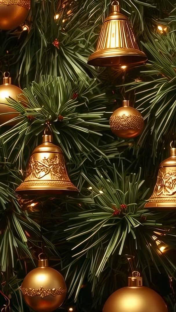 AI Generated Video. Close-up vertical video panning across pine branch decorated with gold bells, textured and smooth baubles, and warm string lights. Soft bokeh and warm glow creating cozy holiday atmosphere. Rich green needles contrasting with metallic gold ornaments for classic festive look. Gentle camera movement offering loopable clip for seamless background use. Use for social media vertical ads, Instagram Reels, TikTok content, holiday product promos, email headers, website hero banner, seasonal greeting cards, digital signage, store displays. Pair with seasonal music or voiceover for promotional spots. Crop-friendly for mobile and portrait formats and color grading friendly for branding tweaks.