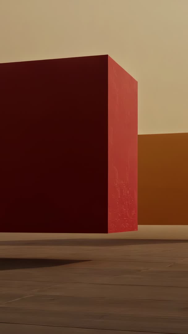 AI Generated Image. Vertical sequence showing red monolith sliding across warm-toned minimalist studio while orange block remains partially hidden. Composition emphasizing geometric forms, strong silhouettes, and wide negative space for text placement. Slow panning motion creating calm, cinematic rhythm and supporting seamless loop editing. Palette combining deep red, ochre, and beige producing modern gallery-style mood. Use ideas: background for vertical ads, social media reels, app promo, architecture and interior design features, art exhibition trailers, product reveal clips, editorial cover visuals, playlist or story covers. Editing suggestions: place bold typography in left negative space, apply subtle vignette for focus, extend loop by matching start and end frames, color-grade to match brand palette. Technical notes: shot in portrait orientation suitable for 9:16 formats, high contrast between block and background ensuring legible overlays, mid-frame floor area providing anchor for logos or lower-third graphics.