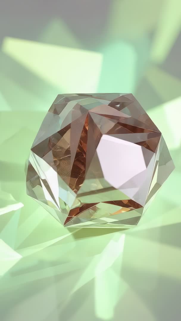 AI Generated Image. Close-up vertical video showcasing rotating faceted amber crystal reflecting and refracting soft green studio light. Facet edges catching highlights and casting kaleidoscopic color shards across glossy surface, creating slow shifting hues from warm amber to mint green. Camera holding tight macro focus while subtle rotation reveals internal refractions and sparkling depth. Lighting creating minimal, neutral mood with upscale luxury feel. Filming in studio using soft diffused lighting, shallow depth of field, loopable clip, high-resolution 9:16 vertical format. Usage ideas: using as background for social media vertical ads, mobile wallpaper, app intro, product promo, jewelry commercial, luxury branding, motion graphic overlay, website hero loop, editorial video opener, mood reel, or ambient backdrop for store display and events. Editing tips: color grade to enhance amber and mint contrasts, add slow crossfade or mirror reflections for seamless loop, apply subtle vignette for focused center composition.