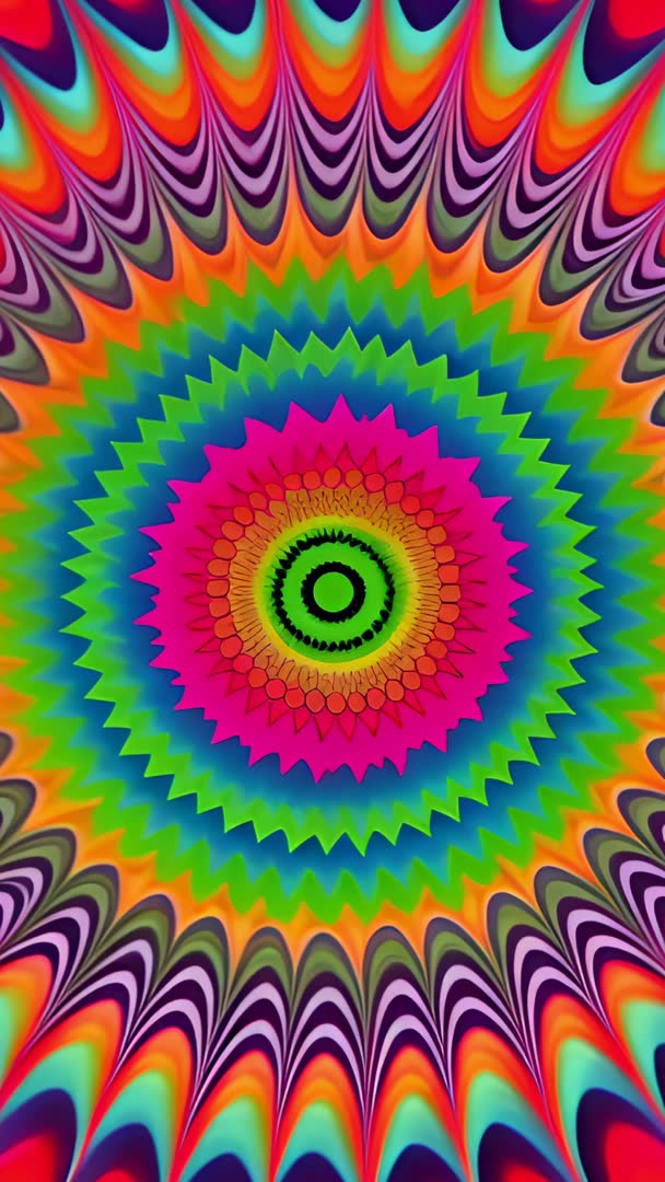 AI Generated Image. Vertical 9:16 video showing kaleidoscopic mandala animation pulsing and breathing with neon rainbow colors. Central mandala rotating subtly while concentric zigzag rings expanding and contracting for hypnotic motion. Vivid color transitions creating psychedelic, mesmerizing visual flow. Loop-friendly opener crafted for vertical screens and short-form video platforms. Suggested uses: - Background for vertical social media stories and reels - Visualizer for electronic music, DJ sets, VJ loops - Meditation and relaxation app intro or ambient visual - Event promo for festivals, parties, retro-themed nights - Mobile wallpaper and screen saver - Motion background for titles, overlays, transitions in video editing - Projection mapping and LED wall ambient content Technical notes: - Vertical 9:16 composition optimized for phones - High saturation and contrast matching neon and retro campaigns - Seamless loop potential with radial symmetry