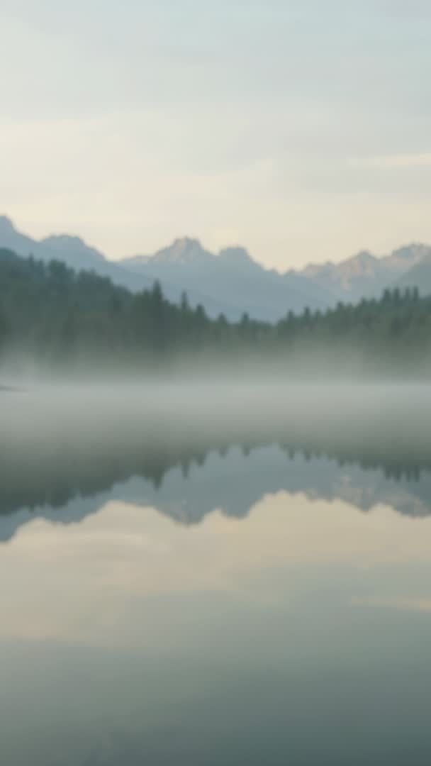 AI Generated Video. Vertical footage capturing slow camera pullback over mist-covered lake, mirror-like water reflecting distant mountain peaks and pine silhouettes. Wooden paddle appearing in foreground, suggesting canoe journey and human presence without showing people. Soft pastel light at dawn creating tranquil mood and cinematic atmosphere. Fog rolling across water adding depth and motion for seamless loop or slow pan. Ideal for vertical social media ads, app backgrounds, meditation or wellness videos, travel and tourism promos, website hero banners, and environmental storytelling. Providing ample top space for title or lower third overlay and working well with ambient music, guided meditation, or slow product reveal.