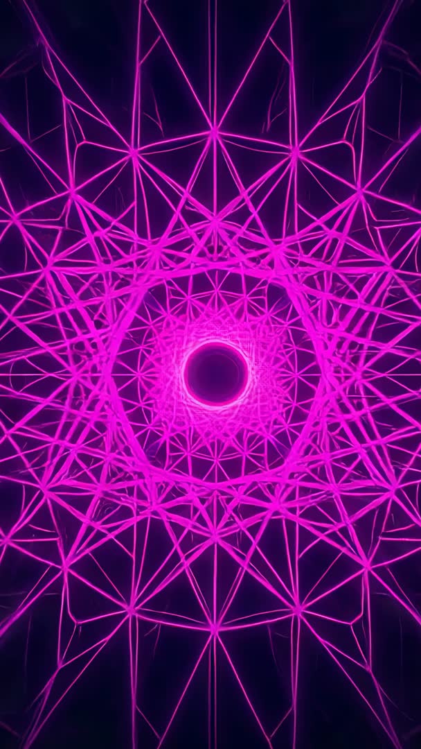 AI Generated Image. Vertical loopable neon animation showing magenta wireframe lattice pulsing, rotating and expanding around central core. Concentric hexagon rings and radial geometry creating hypnotic tunnel and vortex effect with deep neon glow against dark void. High-contrast 9:16 composition optimized for mobile devices and loop-ready playback. Ideal for music visualizers, club VJ loops, concert backdrops, social media reels, vertical ads, livestream overlays, mobile wallpapers, app intros, tech promos, sci-fi trailers and ambient meditation visuals. Allowing easy color grading and logo or text overlay for branding, title sequences and transitions. Providing modern cyberpunk aesthetic and dynamic motion for futuristic or abstract projects.
