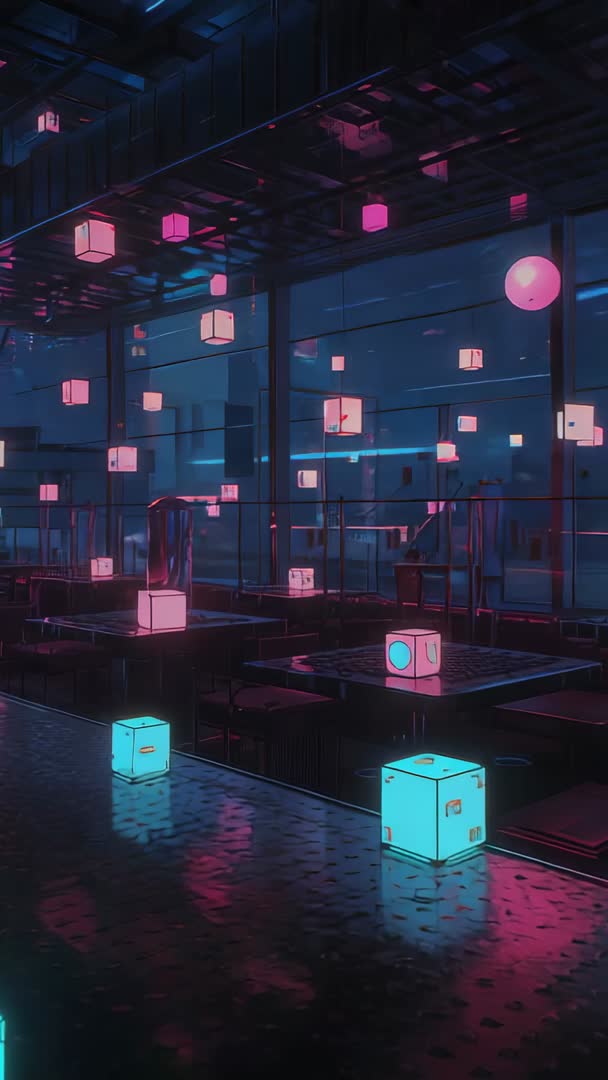 AI Generated Video. Vertical video pushing forward through neon lounge, revealing glowing cyan cube resting on wet reflective floor beside glass wall. Suspended magenta cube lights floating throughout frame, creating rich reflections and layered depth. Camera movement providing cinematic reveal and ample vertical copy space for headlines, logos, or UI elements. Color palette combining cyan and magenta for futuristic, cyberpunk mood. Suiting tech promo, app intro, social vertical ad, music video opener, title reveal, product showcase, or website hero banner. Working well as looping background for events, displays, or motion graphics. Delivering high-contrast visual anchor that is easy to overlay with text, call-to-action, or product shots.
