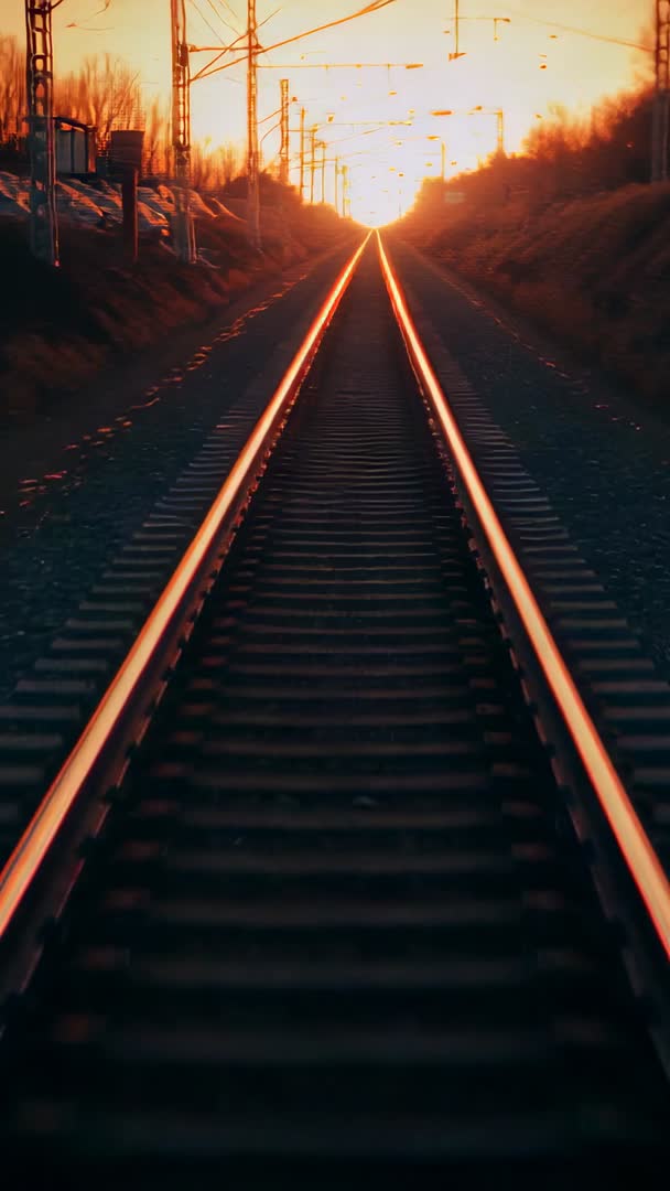 AI Generated Image. Showing parallel railway tracks stretching toward glowing sunrise, sunlight casting golden highlights along rails and sleepers. Overhead catenary poles and wires creating rhythmic vertical elements while embankments and bare trees flank track. Strong leading lines and deep perspective creating cinematic, dramatic mood ideal for storytelling about journey, direction, new beginnings. Suitable for travel and transport campaigns, rail industry promos, inspirational social media vertical ads, phone wallpapers, video openers, backgrounds for titles or quotes, or editorial pieces on infrastructure and commuting. Recommend slow push-in camera move, warm color grade, subtle lens flare, overlaying bold typography in upper third, and ambient soundtrack or soft piano to heighten emotional impact.