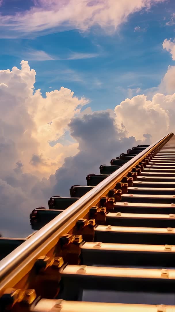 AI Generated Image. Showing close-up of railway rails and sleepers pushing upward into expansive cloudscape with warm golden light casting reflective highlights on metal surfaces. Featuring strong diagonal leading lines and deep perspective drawing eye toward open sky and towering clouds. Vertical video composition with generous copy space above rails for title or overlay text. Ideal for use as hero background for travel websites, landing pages, social vertical video content for Instagram Reels, TikTok, YouTube Shorts. Working well for themes of journey, ambition, escape, dreamlike ascent, transport and engineering. Pairing with slow push-up camera movement and cinematic score for dramatic opener or promotional reel. Color grading suggestions: enhance warm highlights, increase contrast and slightly boost saturation for cinematic mood. Suitable for stock footage libraries, commercial advertisements, editorial articles, book covers and poster art.