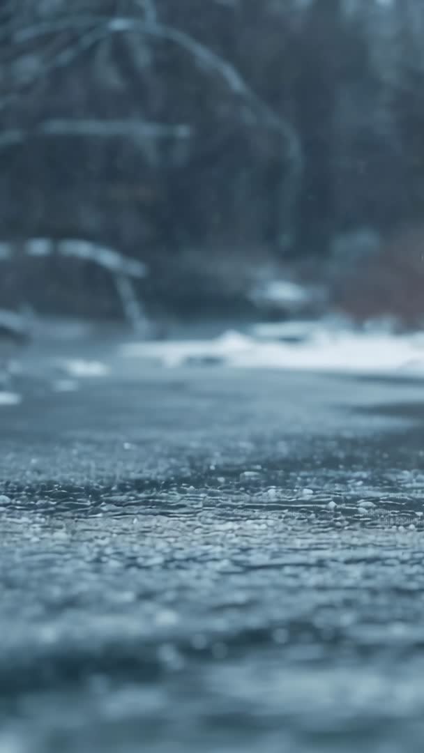 AI Generated Video. Showing steady rain falling onto wet pavement puddle, creating ripples and splashes in shallow focus. Featuring close-up surface detail with droplets forming concentric rings and subtle water texture. Presenting desaturated, overcast color palette with blurred tree line and snow patches in background, conveying cold, late-winter mood. Working well in vertical format, optimized for mobile screens and social platforms. Ideal for social media stories, Instagram Reels, TikTok content, mobile video ads, weather segments, relaxation or meditation loops, ambient background for websites, vlog transitions. Loop-friendly clip for calming visuals and sound design, useful for apps, presentations, product pages, nature-themed campaigns and editorial weather coverage.