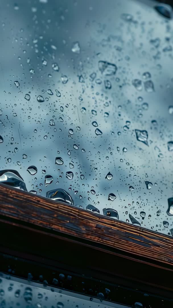 AI Generated Image. Vertical video showing raindrops gathering on tempered glass window sash while droplets merge and slide along wood frame under overcast sky. Close-up composition highlighting bead patterns, streak marks, and soft background bokeh for atmospheric, moody look. Working well as B-roll for weather reports, documentary openings, home improvement or window product commercials, and cinematic transitions. Serving as calming backdrop for meditation or wellness apps, social media stories, mobile ads, and title overlays. Suggestion: loop clip for seamless background, add subtle rain ambience for immersive sound design, and color grade to match project palette. Delivering vertical format ready content ideal for Instagram Reels, TikTok, mobile-first campaigns, and news or lifestyle segments.