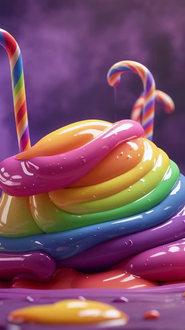 AI Generated Image. Showing close-up of rainbow glossy liquid mound pulsing on smooth surface with striped candy canes dripping colorful syrup. Featuring vibrant neon palette, high-gloss reflections, and soft purple backdrop to emphasize playful dessert vibe. Serving to create vertical social clips, mobile wallpapers, music video intros, and product promo spots. Suggesting use in confectionery branding, dessert packaging visuals, ASMR content, kids entertainment, and party invitation motion graphics. Providing loop-friendly motion and 4K-ready vertical frame for seamless editing and mobile-first campaigns.