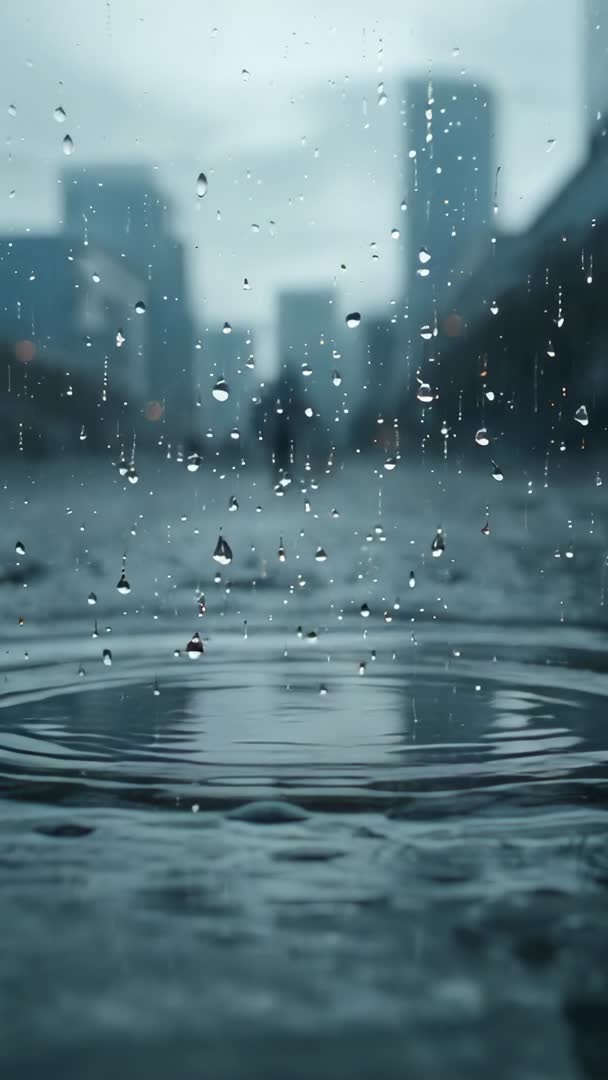 AI Generated Video. Showing close-up of falling raindrops on glass and concentric ripples spreading across shallow puddle with blurred city skyline in background. Capturing moody, cinematic atmosphere with cool blue tones and soft bokeh from distant lights. Emphasizing texture of water droplets and reflective surface for dramatic visual interest. Working well as vertical video background for social media stories, mobile wallpapers, app intros, and weather segments. Pairing with ambient music or gentle narration for relaxing promo, meditation, or cinematic montage. Looping seamlessly for continuous background use or slowing down for dramatic slow-motion effect. Leaving space in upper third for overlay text or branding. Ideal for advertising umbrellas, rain gear, travel, insurance, and urban lifestyle campaigns. Delivering strong visual metaphor for change, reflection, cleansing, and emotional mood.