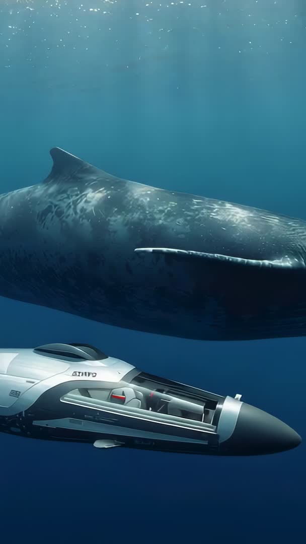 AI Generated Video. Video showing sleek research submersible gliding under giant whale in clear blue ocean. Interior cockpit visible with pilot wearing light suit aligning sub under whale for observation. Sunlight rays filtering through water creating peaceful, immersive mood. Footage suitable for documentary sequences, science education clips, environmental campaigns, technology demonstrations, tourism promos, and social media vertical ads. Suggested edits include adding lower third titles for scientist names, overlaying telemetry graphics to emphasize research data, and adding ambient ocean sound design for realism. Licensing ideas include stock usage for marine biology presentations, museum exhibits, conservation fundraising, corporate sustainability reports, and VR or immersive experiences. Duration flexible for looping background or longer narrative segments.