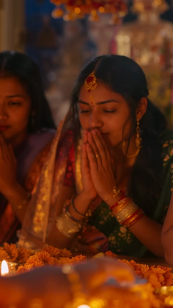 AI Generated Image. Close-up vertical footage showing woman wearing sari folding palms in prayer at shrine surrounded by diyas and marigold flowers. Warm candlelight and soft bokeh creating intimate devotional atmosphere. Ideal for festival and religious content, Diwali campaigns, spiritual storytelling, cultural documentaries, greeting and social media reels. Serving as background B-roll for lifestyle and travel features, faith-based advertising, meditation and mindfulness promotions, event posters and website hero clips. Suggesting color grading to enhance warm tones and preserve soft highlights for authentic look. Including vertical composition for mobile-first platforms and short-form video use.