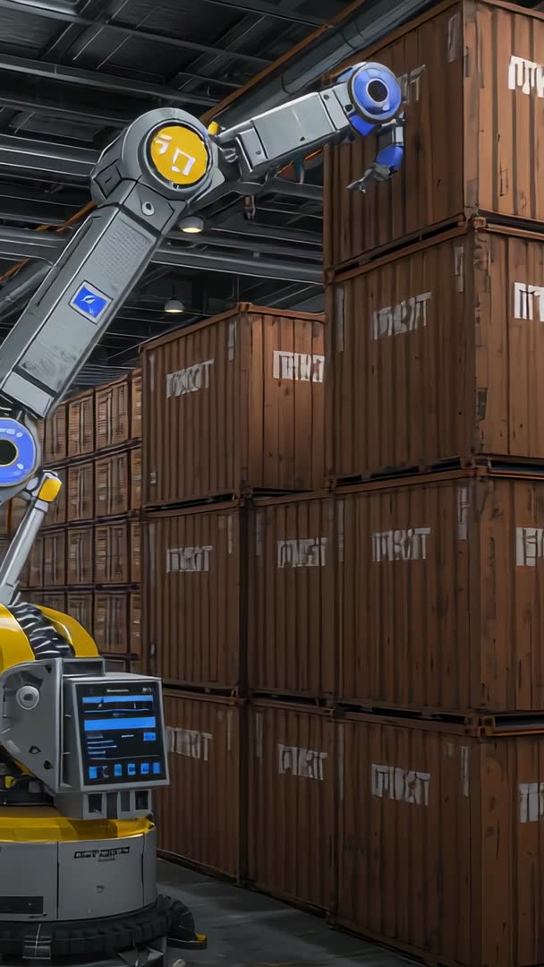 AI Generated Image. Vertical video showing extending robotic arm reaching top shipping crate inside industrial warehouse, with illuminated control console and overhead LED lighting. Scene focusing on precision handling, automated inspection, machine vision scanning, and container stacking operations. Useful for marketing automation solutions, supply chain presentations, training materials for warehouse staff, corporate technology demos, online courses on robotics, and background footage for commercials or news segments. Footage working well for vertical formats on social media stories, mobile ads, product pages, and onboarding videos. Color palette featuring industrial yellows, blues, and warm brown containers, creating strong contrast for subject emphasis.