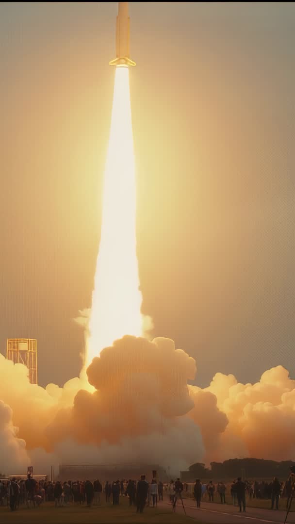 AI Generated Image. Video showing rocket lifting off from pad, emitting blazing plume and towering smoke while crowd in foreground filming on phones and silhouetting against warm golden light. Featuring vertical composition ideal for mobile and social platforms, strong backlight creating dramatic silhouettes, high-contrast highlights from engine flames and dynamic smoke shapes. Suitable for aerospace advertising, technology launch promos, news coverage, documentary sequences, educational outreach and STEM campaign content. Use as hero clip for website landing pages, background for event recaps, opener for broadcast segments, vertical reel for social media, or B-roll for corporate presentations. Editing suggestions: trimming to short vertical cuts for reels, applying slow-motion for dramatic ascent, color grading to enhance warm tones, adding ambient launch sound or orchestral sting for impact. Captioning ideas: include mission name, launch time, launch site and organization details when available. Licensing note: verify rights and safety clearance for crowd footage when using in commercial projects.
