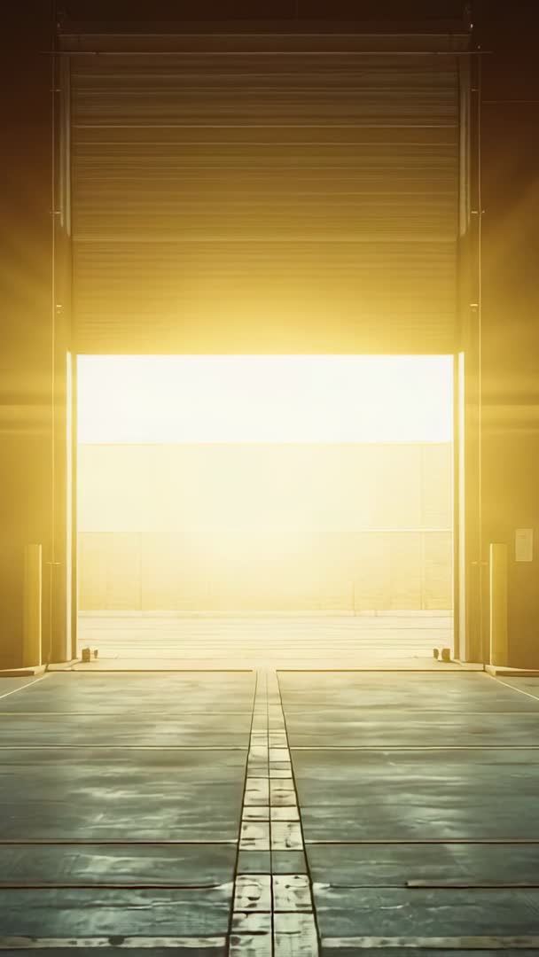 AI Generated Video. Vertical cinematic clip showing rollup shutter rising and pouring warm golden light into empty industrial loading bay. Frame emphasizing concrete floor seam leading toward bright threshold, creating strong perspective lines and dramatic backlighting. Footage suiting opening sequences, commercial intros, logistics branding, safety training, architectural visualization, and social vertical ads. File working well for adding text overlays, animated graphics, slow-motion segments, or color grading to enhance cinematic mood. Ideal for editors seeking moody, minimal, high-contrast industrial visuals to communicate movement, opportunity, or new beginnings.
